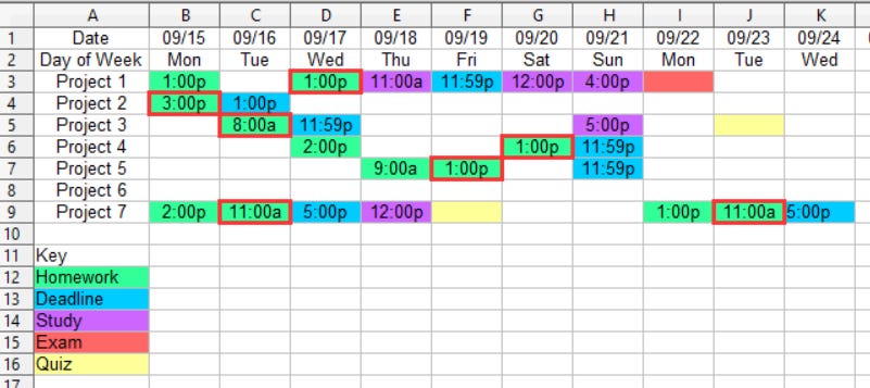 The schedule is read chronologically from left to right. Each column is one day, and each row is a different project or class, with its own set of work and deadlines.