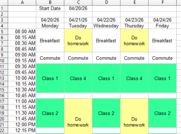 This spreadsheet is read chronologically from top to bottom (in one day) and from left to right (from one day to the next). Blocks of time are assigned a day, time, and task.