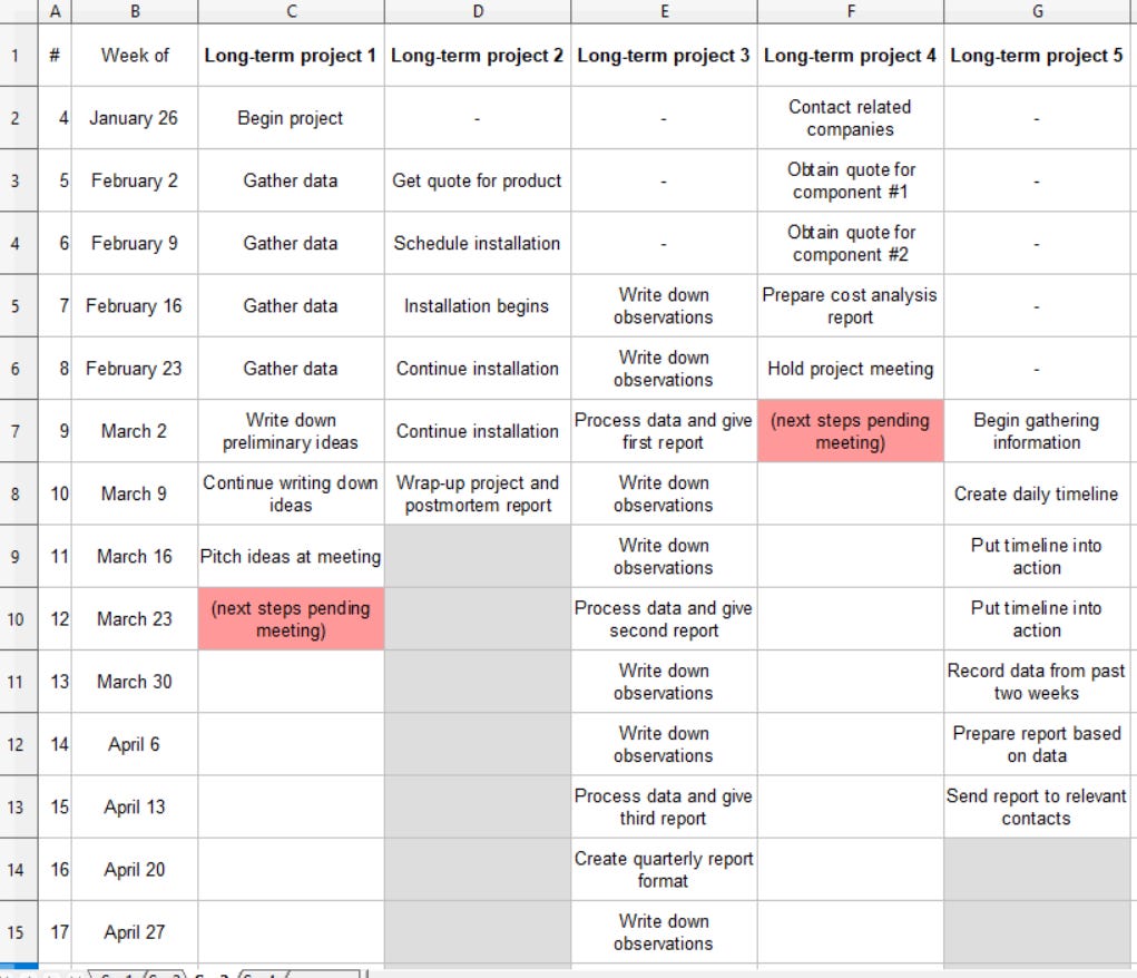 Professional projects tend to be large and span multiple weeks. To keep projects on track long-term and avoid losing focus completely, it helps to plan out an extremely high-level set of weekly goals over the course of months or years.